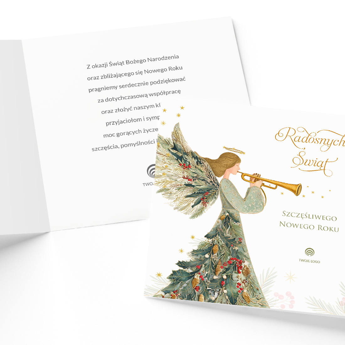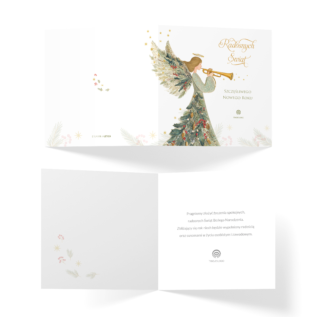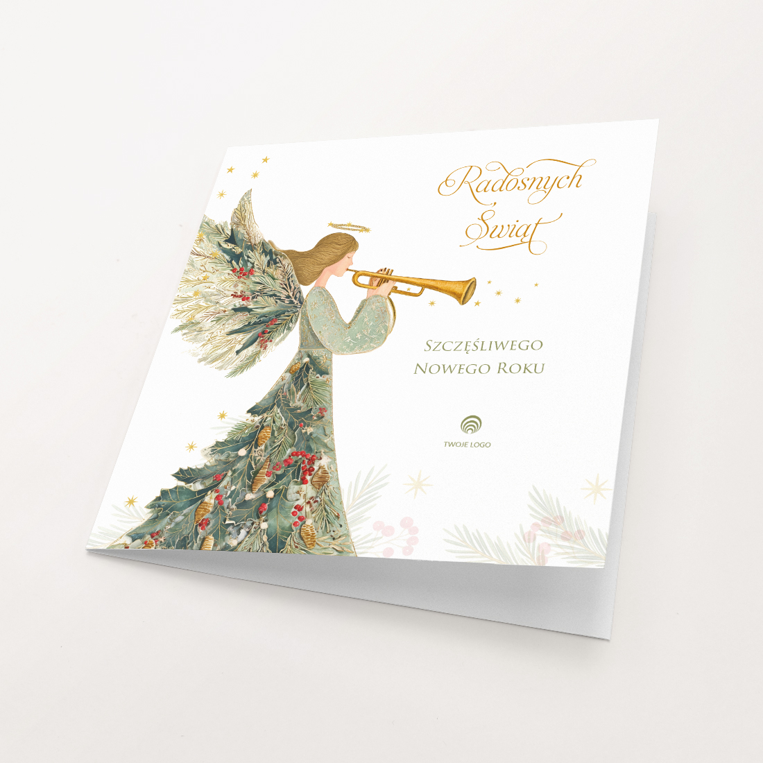 ANIOŁ BOŻEGO NARODZENIA to unikalna kartka świąteczna w formacie K4 składana, na której głównym motywem jest anioł grający na złotej trąbce. Postać anioła ubrana jest w szatę przypominającą choinkę ozdobioną gałązkami, szyszkami i czerwonymi owocami jarzębiny. Złote elementy podkreślają wyjątkowy charakter kartki i nadają jej eleganckiego, świątecznego blasku. Wnętrze kartki zawiera gotowe życzenia, jednak istnieje możliwość personalizacji treści zgodnie z oczekiwaniami klienta.
