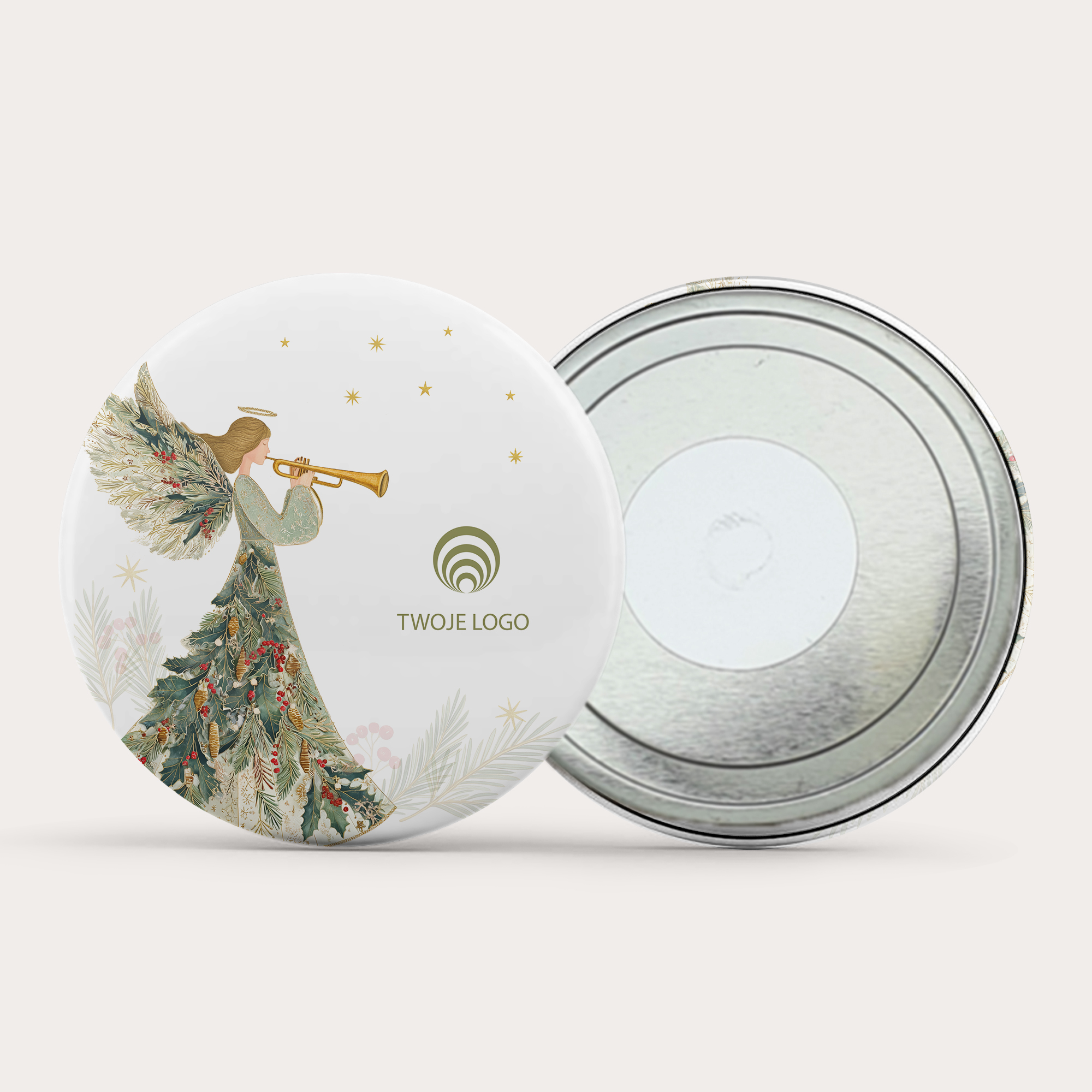 ANIOŁ BOŻEGO NARODZENIA Magnes Aniołek wykonany został z aluminium o średnicy 56 mm. Grafika przedstawia anioła w sukni z motywem gałązek i ozdób bożonarodzeniowych, grającego na trąbce. Na białym tle rozmieszczono delikatne złote gwiazdki, a obok znajduje się miejsce na logo firmy, dzięki czemu powstaje elegancki i w pełni personalizowany magnes reklamowy na Boże Narodzenie.