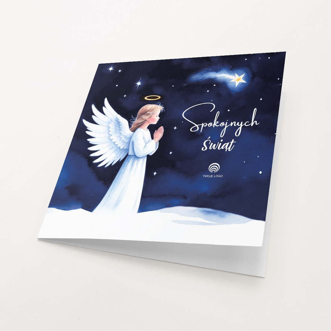 Kartka bożonarodzeniowa z logo firmy ANIOŁ ŚWIĄTECZNY posiada kwadratowy, rozkładany format, co umożliwia wygodne umieszczenie życzeń oraz logo firmy. Solidne wykonanie z wysokiej jakości papieru gwarantuje trwałość i estetyczny wygląd, który z pewnością zachwyci każdego odbiorcę.