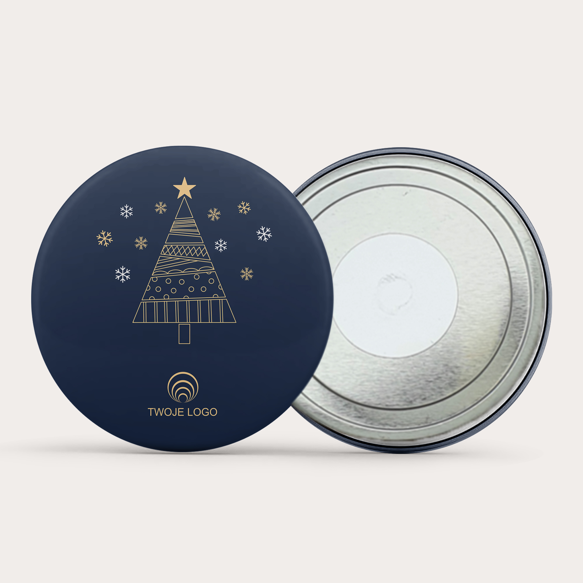 Magnes Złota Jodełka o średnicy 56 mm wykonany został z lekkiego, trwałego aluminium. Jego front zdobi graficzna, złota choinka w geometrycznym stylu, otoczona subtelnymi śnieżynkami w odcieniach bieli i złota, na granatowym tle. Dolna część powierzchni zawiera miejsce na personalizowane logo, co sprawia, że magnes staje się zarówno ozdobą, jak i nośnikiem marki.