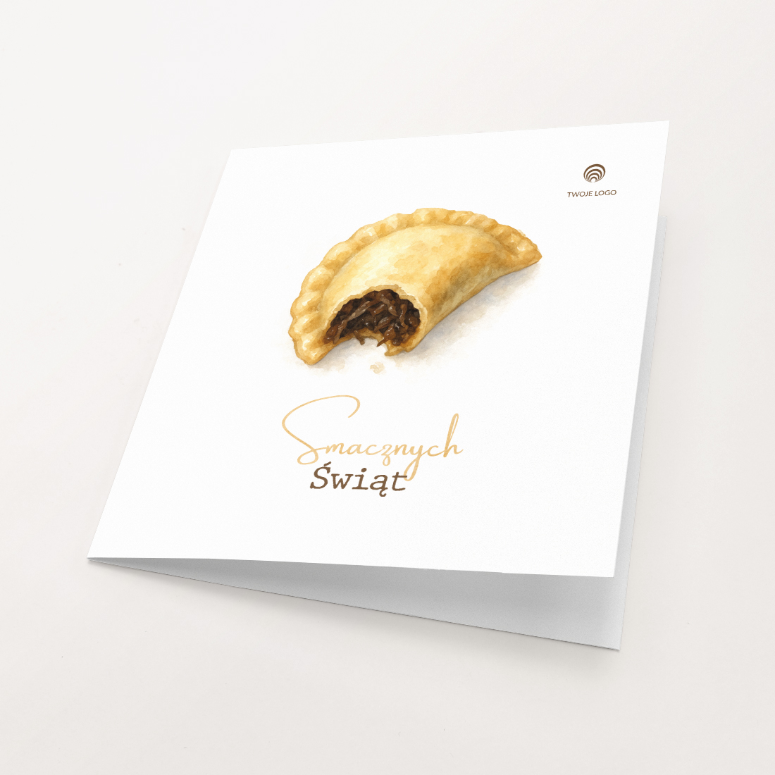 Kartka w formacie K4 składana wyróżnia się minimalistycznym, a jednocześnie zabawnym projektem. Na okładce widnieje realistyczna ilustracja pieroga z charakterystycznym „gryzem”, który od razu przywołuje atmosferę świątecznego stołu. Całość uzupełnia napis „Smacznych Świąt” w nowoczesnej typografii. Wnętrze kartki pozostawia możliwość wyboru życzeń – możesz skorzystać z gotowych propozycji lub wprowadzić własny tekst, dopasowany do stylu Twojej firmy.