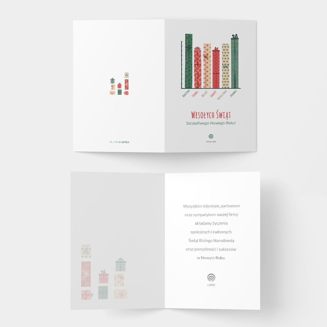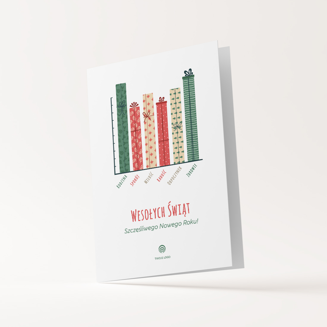 Motyw kartki został zaprojektowany w formie wykresu słupkowego, gdzie kolorowe prezenty symbolizują najważniejsze wartości: rodzinę, spokój, miłość, radość, odpoczynek i zdrowie. Dzięki temu całość nabiera nowoczesnego, a jednocześnie pełnego ciepła charakteru. Format A6 składany sprawia, że kartka jest poręczna i elegancka. Wewnątrz znajdują się gotowe życzenia, ale istnieje również możliwość personalizacji treści według potrzeb firmy.