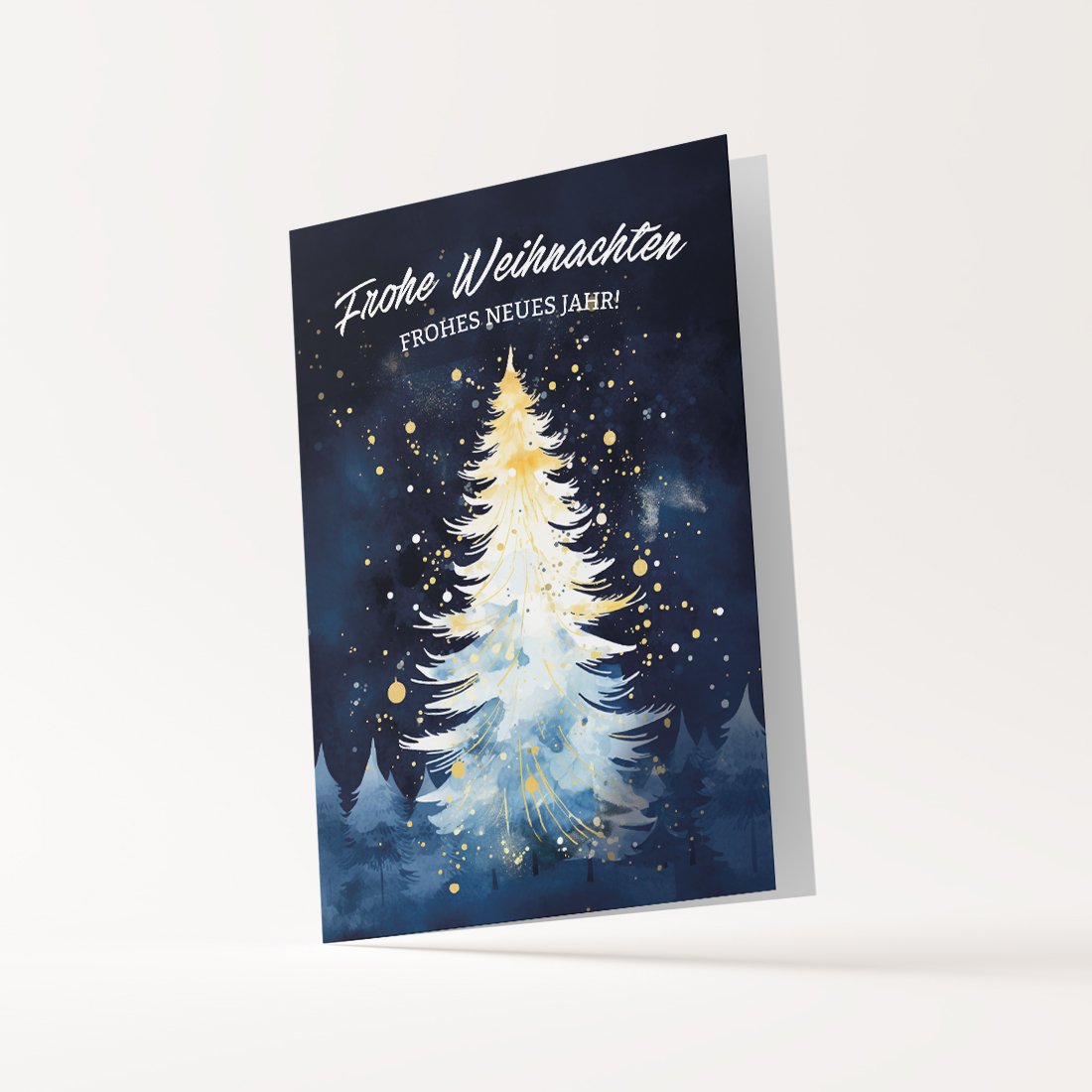 Eleganckie firmowe życzenia świąteczne na wyciągnięcie ręki. Nasza kartka świąteczna firmowa z choinką stanowi doskonałe połączenie tradycji i indywidualnego podejścia do klienta. Składana konstrukcja prostokątna zapewnia wystarczającą przestrzeń na prezentowanie Twojego logo oraz dowolnie wybranych życzeń. Akwarelowa choinka w odcieniach białym i złotym zdaje się być namalowana przez artystę. Jej delikatny wygląd kontrastuje z granatowym tłem przedstawiającym noc. Akwarelowe gwiazdki rozświetlają niebo, tworząc atmosferę spokoju i radości. Nad choinką widnieje tradycyjne życzenie „Wesołych Świąt” oraz „Szczęśliwego Nowego Roku”. Szukając idealnej firmowej kartki z życzeniami świątecznymi, warto postawić na jakość i oryginalność. Nasza propozycja nie tylko doskonale prezentuje się wizualnie, ale również oferuje możliwość dostosowania jej do indywidualnych potrzeb. Wybierając choinkę na kartce świątecznej firmowej z logo, gwarantujesz, że Twoje życzenia dotrą do odbiorcy w niezapomniany sposób.