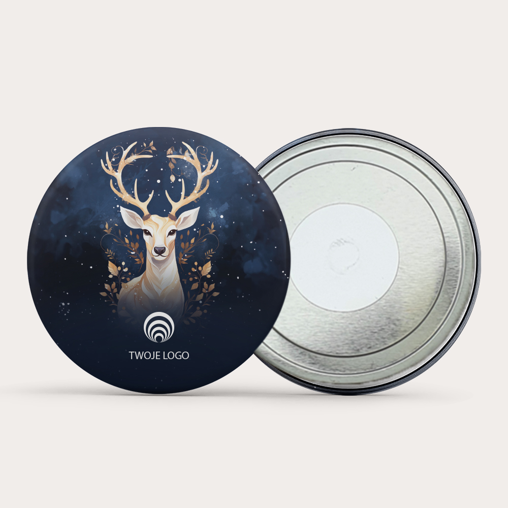 Magnes o średnicy 56 mm, wykonany z aluminium, zachwyca głębią kolorów i precyzją nadruku. Na jego froncie widoczny jest majestatyczny renifer o złocistych porożach, otoczony subtelnymi roślinnymi ornamentami, umieszczony na tle nocnego, gwieździstego nieba. Centralna przestrzeń przewidziana jest na logo firmy, dzięki czemu MAGICZNY RENIFER Magnesy Świąteczne staje się nie tylko dekoracją, ale także eleganckim nośnikiem reklamy.