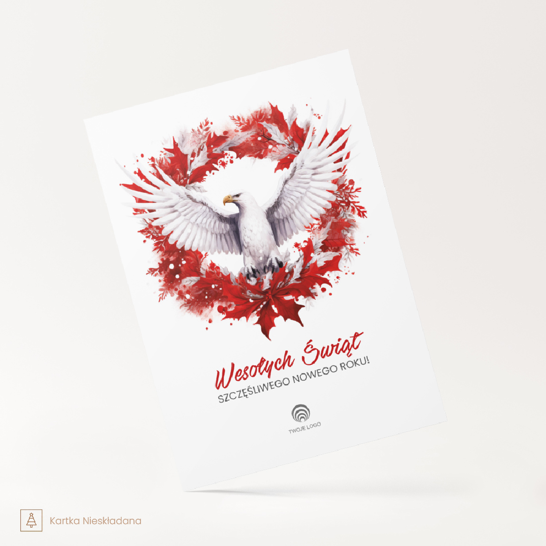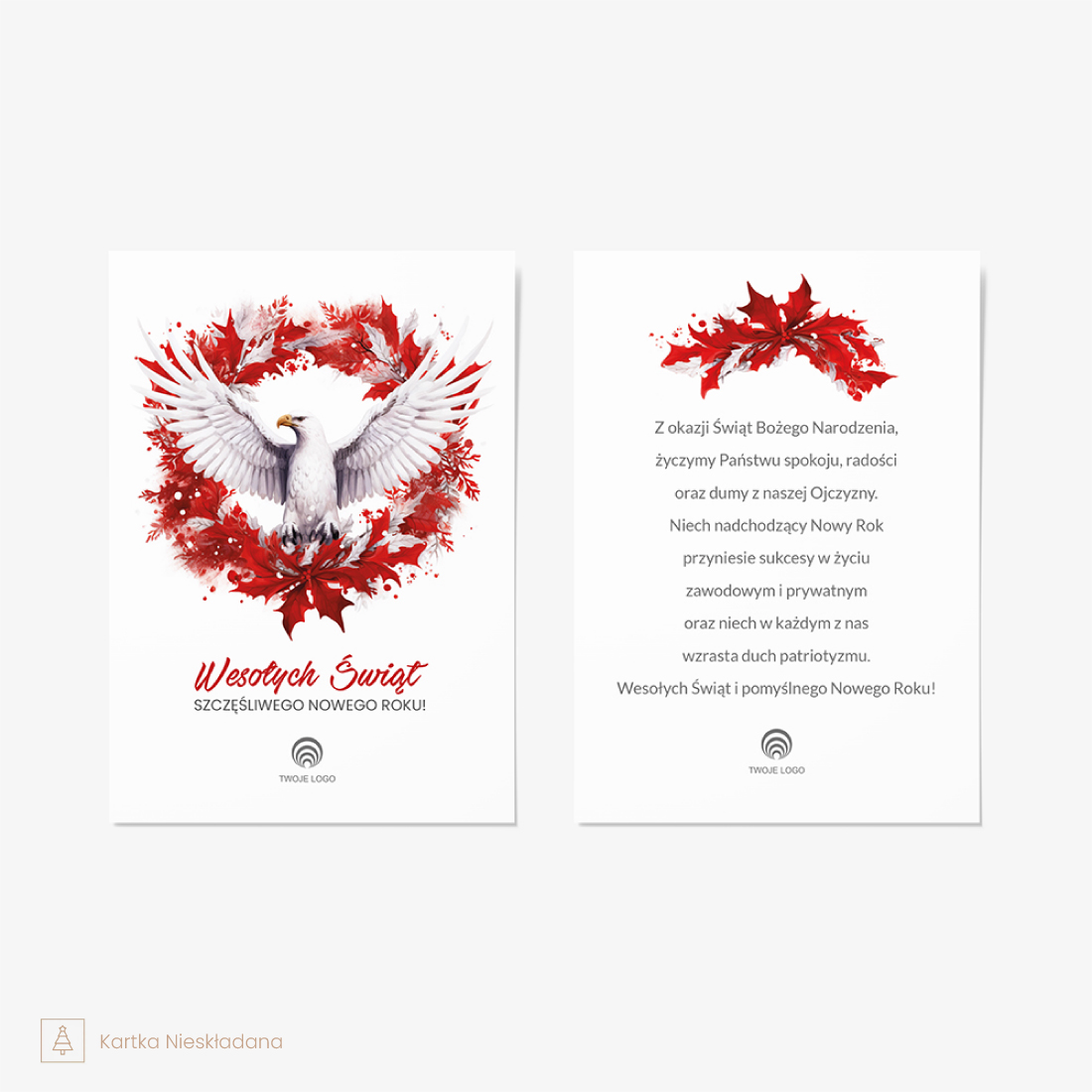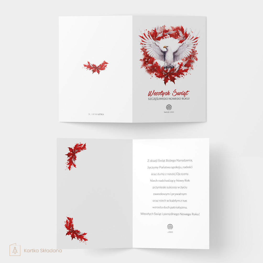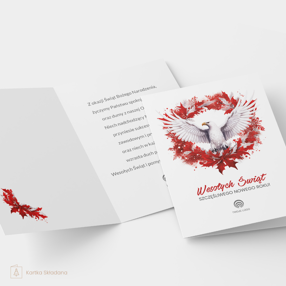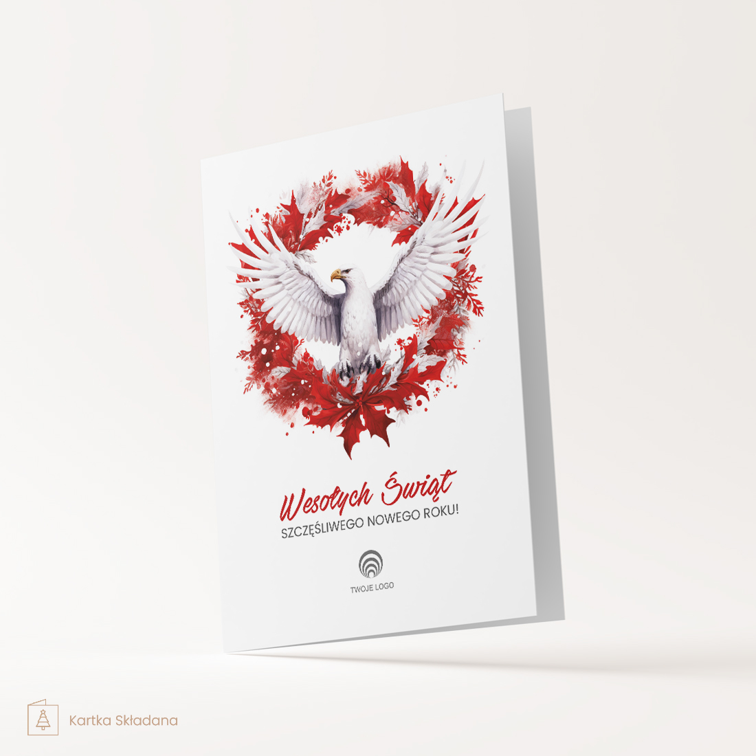 Kartka Patriotyczna Bożonarodzeniowa z Logo ORZEŁ BIAŁY to unikatowa propozycja dla firm i instytucji, które pragną wysłać swoim klientom, partnerom biznesowym i pracownikom życzenia bożonarodzeniowe z patriotycznym akcentem. Na okładce kartki znajduje się pięknie ilustrowany biały orzeł – symbol polskości i dumy narodowej – otoczony czerwonym wieńcem z liści, co tworzy efektowną kompozycję nawiązującą do barw narodowych. Taka grafika doskonale oddaje ducha narodowej tożsamości i jedności, idealna na święta Bożego Narodzenia.