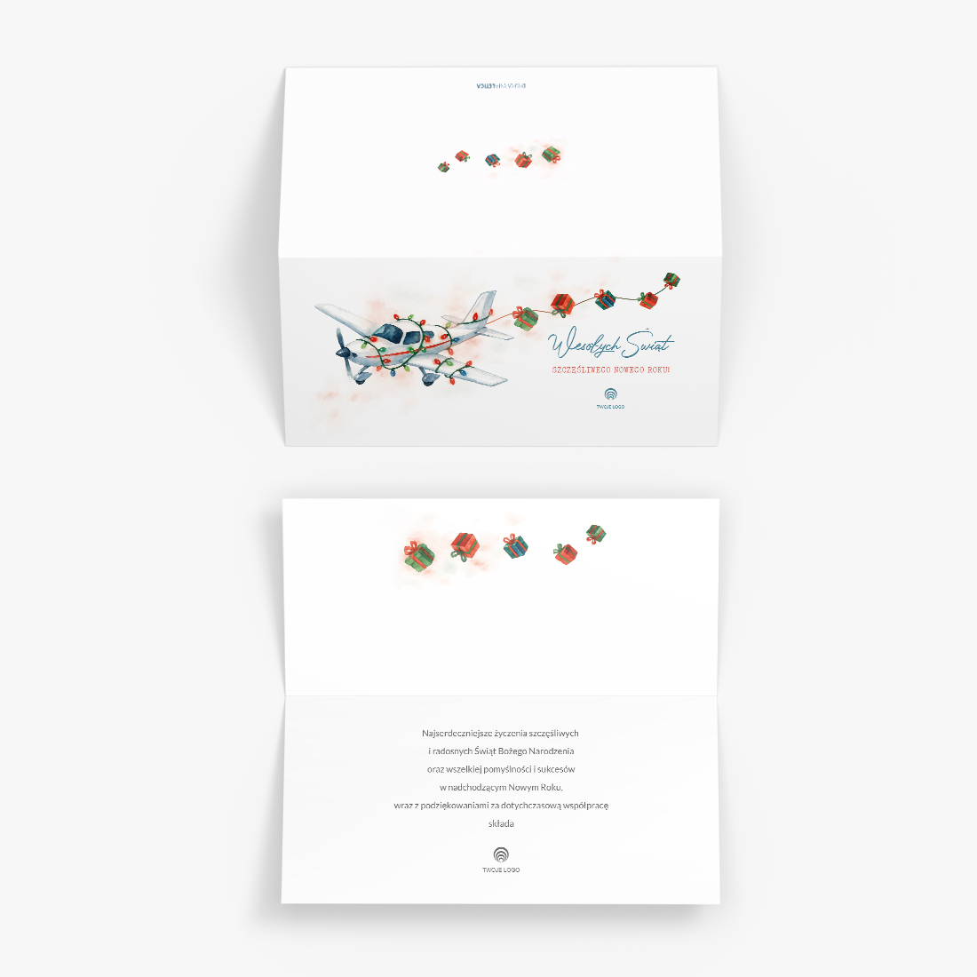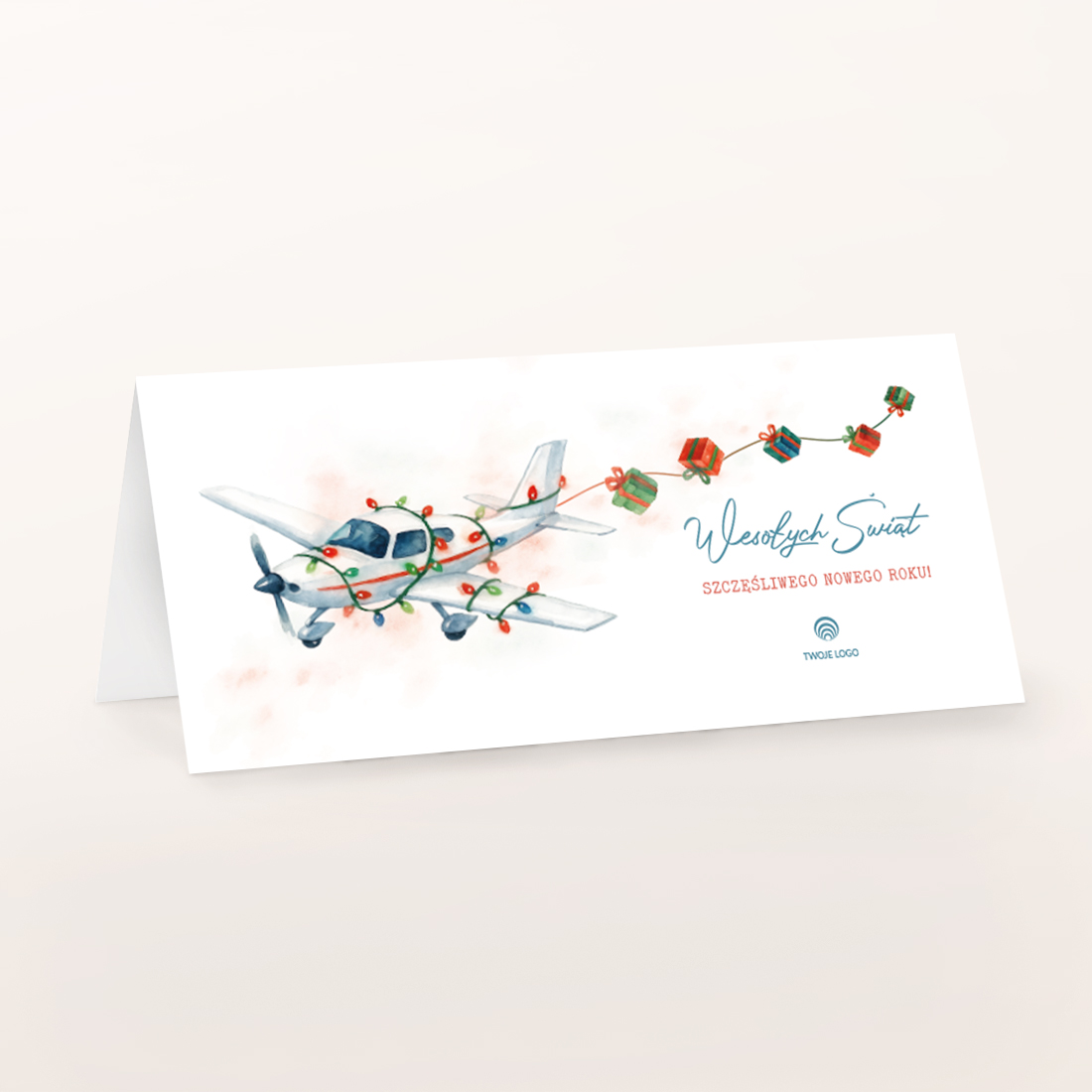 Kartka ŚWIĄTECZNA AWIONETKA Kartki Na Boże Narodzenie Dla Branży Lotniczej to propozycja dla firm, które chcą wyróżnić się oryginalnym designem i jednocześnie nawiązać do świata lotnictwa. Delikatna, akwarelowa ilustracja przedstawia awionetkę ozdobioną świątecznymi lampkami, ciągnącą za sobą prezenty. Format DL składana pozioma sprawia, że kartka prezentuje się elegancko i profesjonalnie, a wnętrze z gotowymi życzeniami (lub możliwością dodania własnego tekstu) podkreśla jej indywidualny charakter.