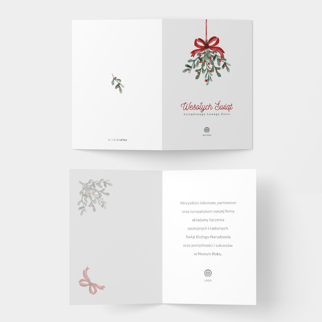 Kartka ŚWIĄTECZNA JEMIOŁA to propozycja dla firm, które cenią minimalizm połączony z odrobiną tradycji. Subtelny motyw zielonej jemioły przewiązanej czerwoną kokardą wprowadza ciepły, świąteczny nastrój, a zarazem prezentuje się elegancko i profesjonalnie. Na froncie kartki znajduje się napis „Wesołych Świąt i Szczęśliwego Nowego Roku”, a wewnątrz umieszczono życzenia – istnieje możliwość wyboru gotowych treści lub wprowadzenia własnych. Delikatna kolorystyka i akwarelowy styl sprawiają, że kartka nabiera wyjątkowego, ręcznie malowanego charakteru.