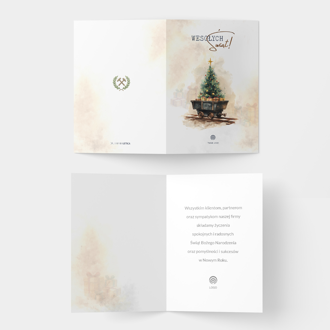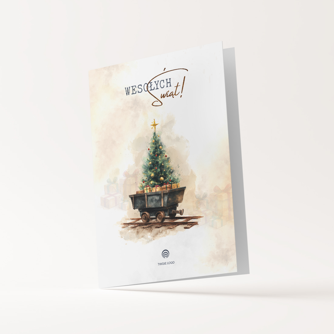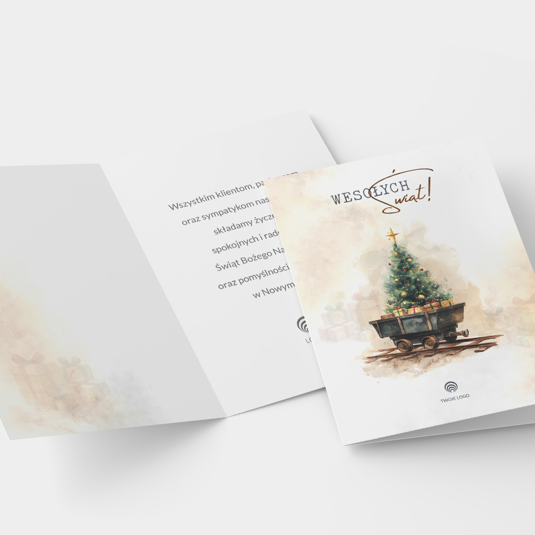 Elegancka kartka świąteczna w formacie A6 składanym została zaprojektowana z myślą o branży górniczej. Motyw przewodni to wagonik górniczy wypełniony prezentami i udekorowaną choinką, otoczony subtelnym, akwarelowym tłem. Dzięki temu kartka łączy tradycyjną symbolikę Bożego Narodzenia z unikalnym charakterem świata wydobywczego. Delikatne detale i dopracowana kolorystyka czynią ten wzór wyjątkowo eleganckim i nieszablonowym.