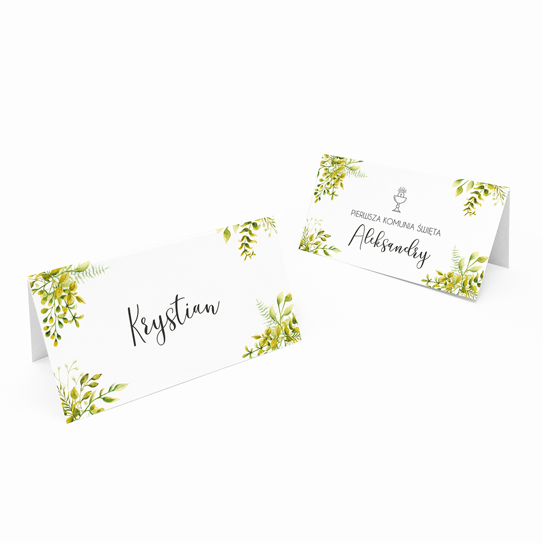 Nie ma nic bardziej pasującego na Twoją Komunię Świętą niż nasze wizytówki na stół SUBTELNOŚĆ personalizowane z imieniem. Ta urocza winietka na stół to idealny dodatek do Twojego stołu podczas uroczystości. Dzięki motywowi zielonemu i roślinnemu, tworzy ona harmonijną atmosferę, która wprowadzi Cię w świąteczny nastrój. Na przodzie wizytówki znajduje się napis „Pierwsza Komunia Święta” wraz z personalizowanym imieniem dziecka, a na tyłach imię gościa, dla którego jest winietka. Możesz spersonalizować imiona, aby nadać wizytówce jeszcze bardziej indywidualnego charakteru.